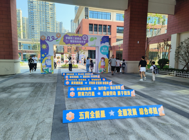 开学当日,校园内彩旗飘扬,处处洋溢着喜庆的氛围。校领导及老师们身着整齐的服装,早早地来到学校,以最饱满的热情、最灿烂的笑容迎接同学们的到来。他们有的在校门口引导新生入校,有的耐心解答家长的疑问,用实际行动传递着对每一位学生的关爱与期待。新生们在家长的陪伴下,迈着轻快的步伐,怀着兴奋与期待的心情走进校园。