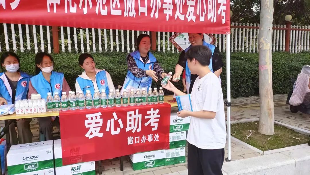 考试前,在文昌中学考点和周口实验高级中学(郸城一高周口校区)考点门口,示范区文昌办事处、搬口办事处、许湾办事处的志愿者们身穿红马甲、蓝马甲早早地来到考点门前,搭建好助考“爱心驿站”,将矿泉水、防暑物资等摆放整齐,要为考试们提供贴心优质服务,为考生们加油鼓劲。