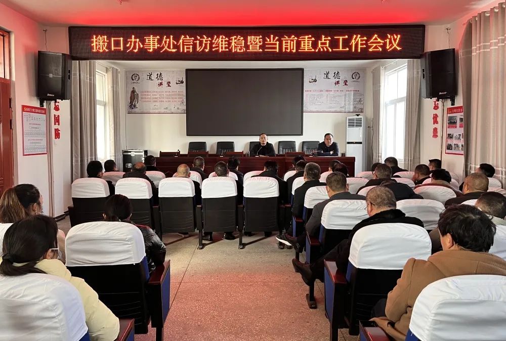 为进一步凝聚共识,汇聚合力,不断提升矛盾处理化解工作水平,扎实有效做好信访维稳工作,2月14日,搬口办事处党委书记张旭主持召开信访维稳暨当前重点工作会议,办事处班子成员、中层干部,中心校、卫生院负责人,各村、社区两委成员共计120余人参加会议。