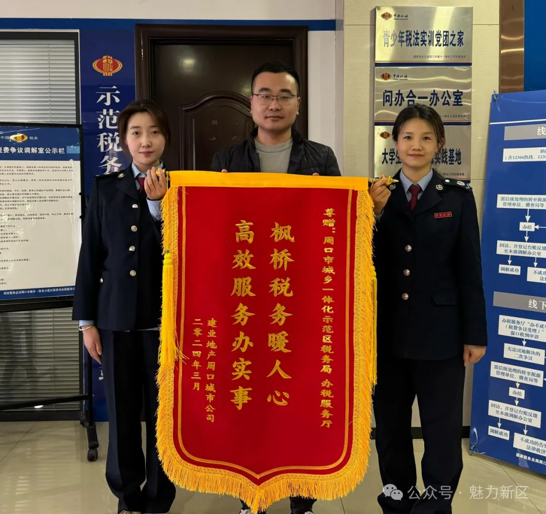 “非常抱歉,上次来办税服务厅,因为时间比较着急,情绪比较激动,多亏税务人员耐心指导,并提供延时服务,才让问题及时解决,当天办理完成,感谢税务部门为我提供这么优质贴心的服务。”近日,建业地产周口城市公司财务负责人孟鹏飞特意为周口市城乡一体化示范区局税务局办税服务厅送来一面印有“枫桥税务暖人心,高效服务办实事”的锦旗,对税务人员的优质服务表示感谢。