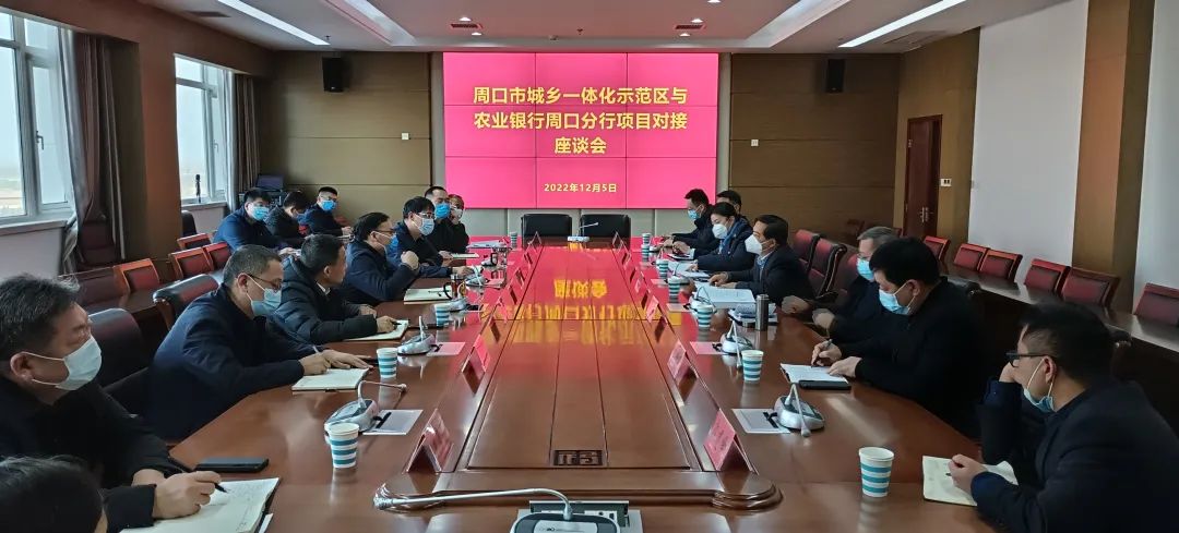 12月5日,市城乡一体化示范区与中国农业银行周口分行举行项目对接座谈会,示范区党工委书记宋力、中国农业银行周口分行行长李正玉出席会议并讲话,区领导张晓、王磊及相关部门负责人参加会议。