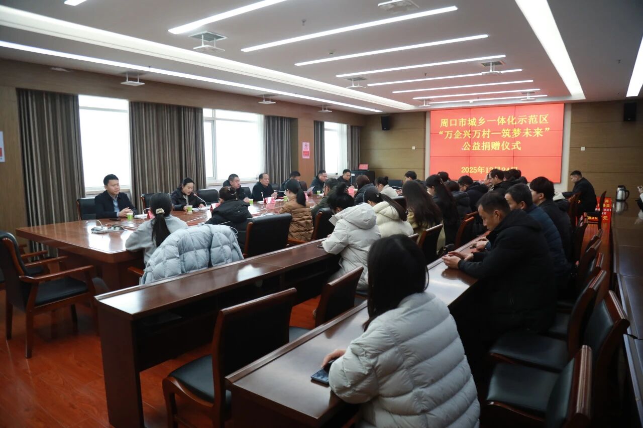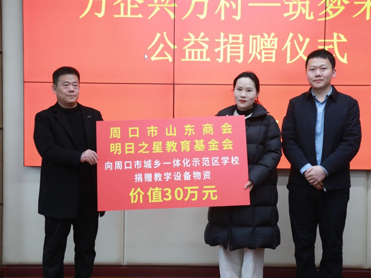 为深入推进“万企兴万村”行动落地见效,精准助力辖区教育优质均衡发展,12月24日上午,市城乡一体化示范区隆重举办“万企兴万村——筑梦未来”公益捐赠仪式。区三级调研员曹运生出席仪式,区工商联、社会事务管理局相关负责人,周口市山东商会、明日之星教育基金会等主办及捐赠单位代表,辖区受赠学校代表共同参加活动。