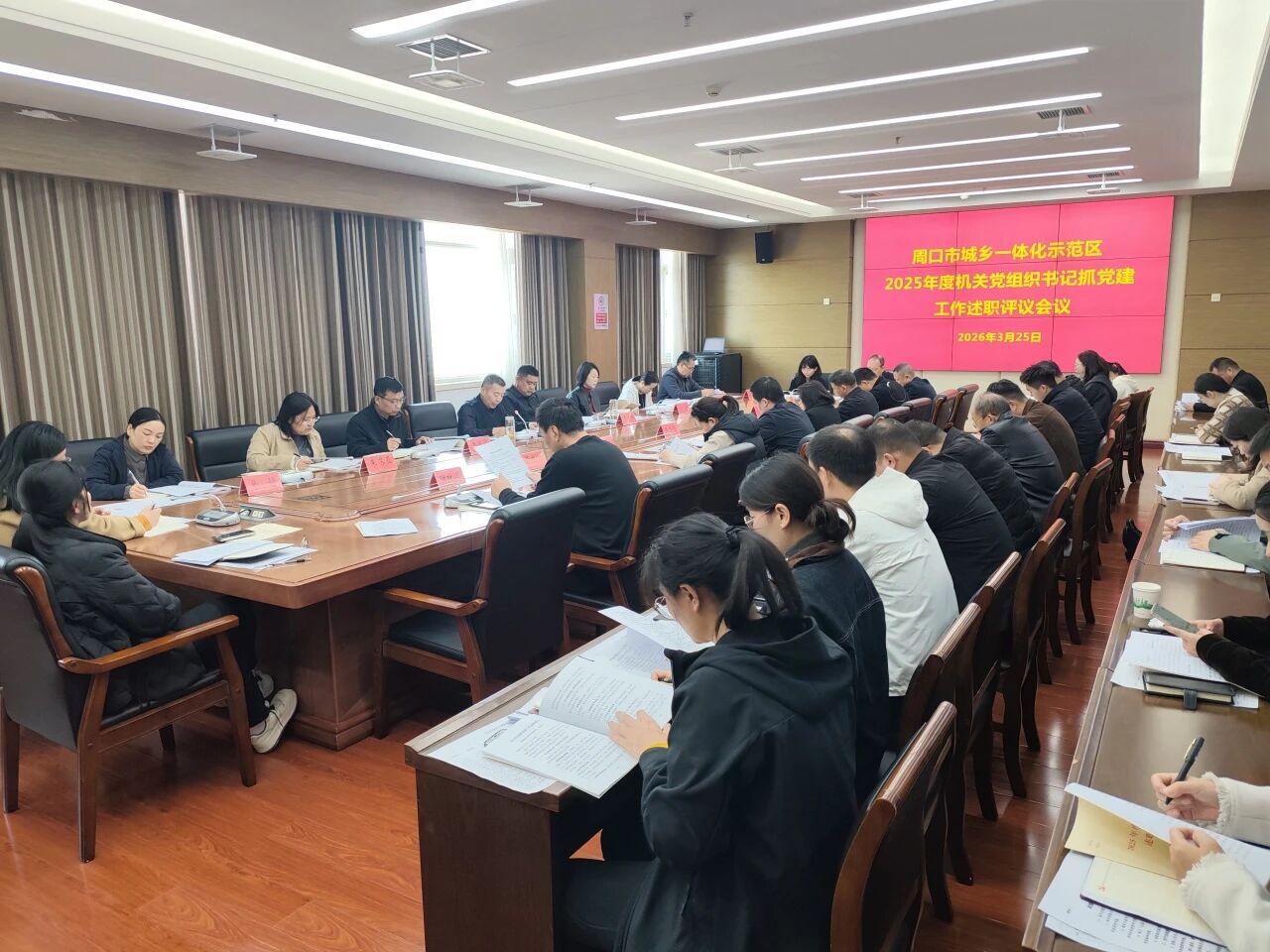 3月25日,市城乡一体化示范区召开2025年度机关党组织书记抓党建工作述职评议会议,全面总结2025年机关党建工作,压实党组织书记抓基层党建责任,谋划部署下一阶段工作。区党工委委员、管委会副主任、机关党委书记李培华主持会议,相关部门负责同志及机关37个党组织书记参会。