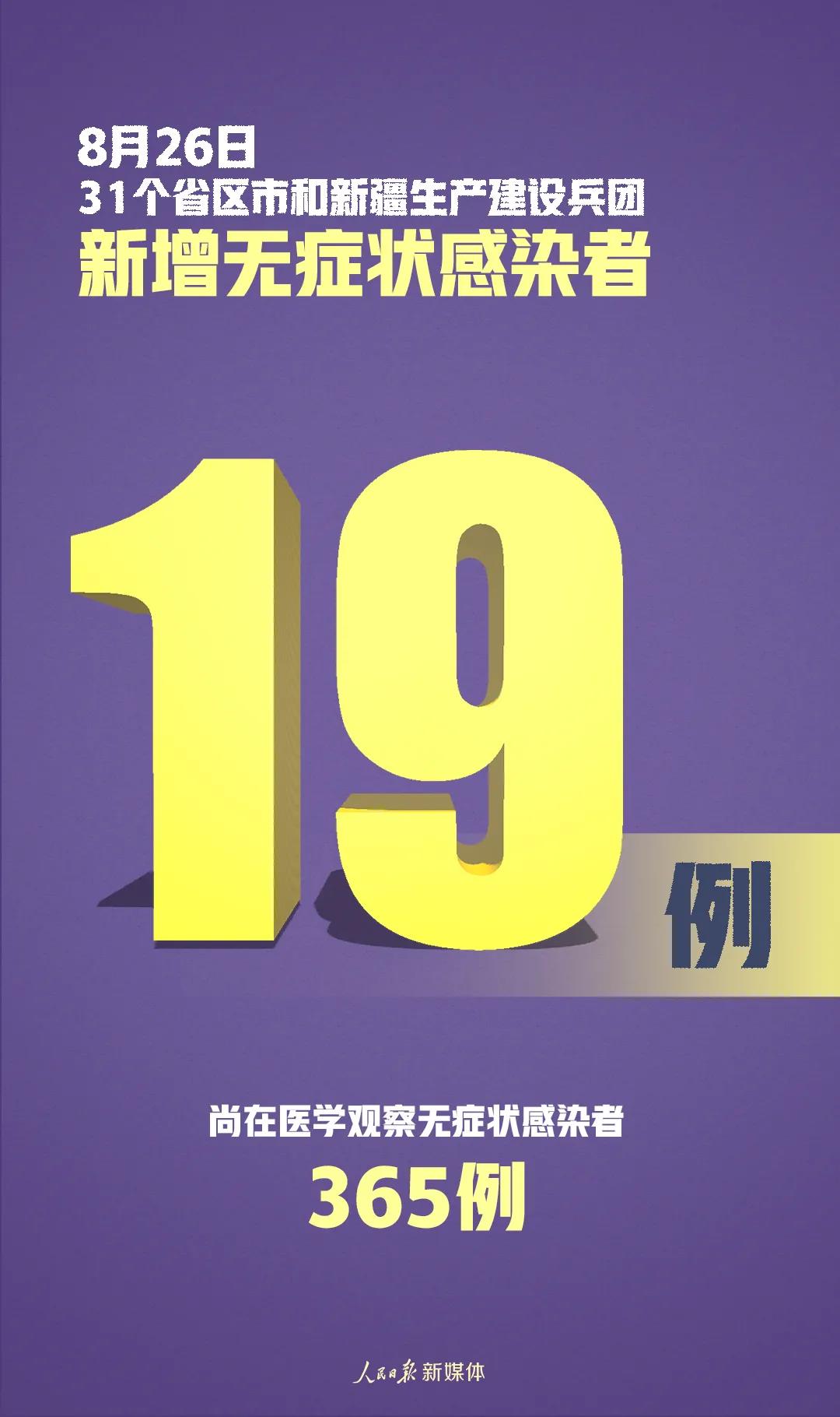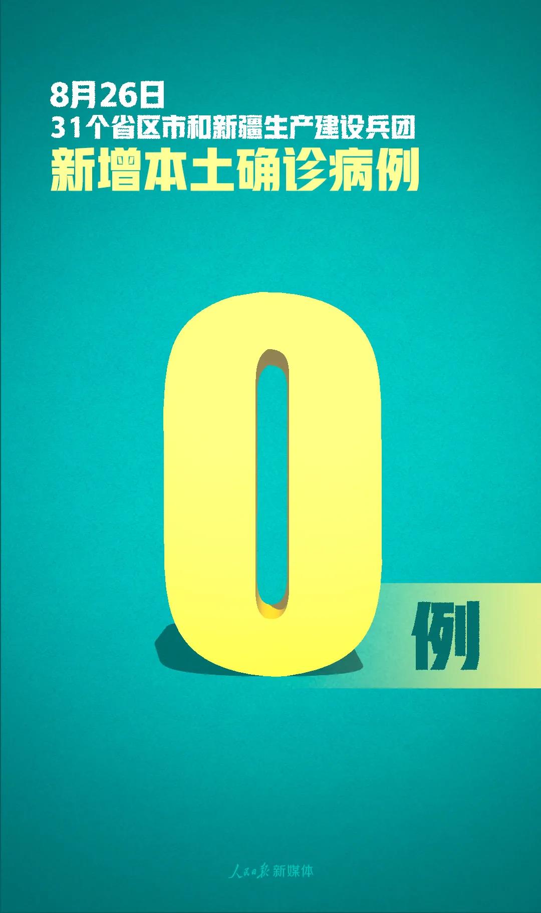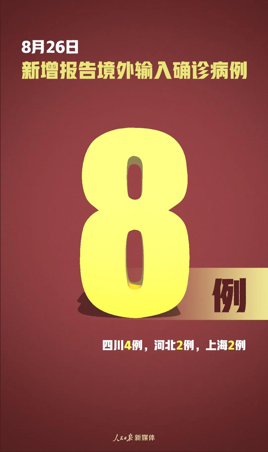 8月26日0—24时,31个省(自治区、直辖市)和新疆生产建设兵团报告新增确诊病例8例,均为境外输入病例(四川4例,河北2例,上海2例);无新增死亡病例;新增疑似病例1例,为境外输入病例(在上海)。